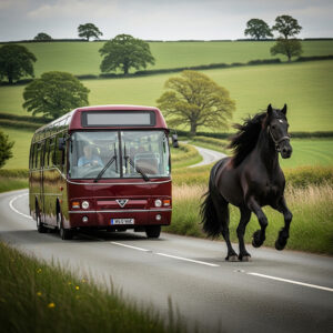 De entre los árboles, como de la nada, un caballo corrió hacia la carretera. Negro, brillante, claramente no salvaje: bien cuidado, con una crin espesa y ojos tiernos. Alcanzó fácilmente al autobús, corriendo a su lado, sin quedarse atrás ni un metro.