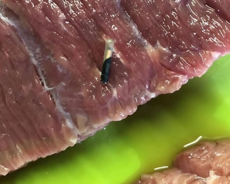 Normalmente, deberían retirarlos antes de vender la carne. Cómo llegó un trozo de ese aparato a la carne que compré sigue siendo un misterio.