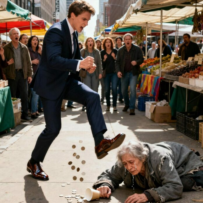 Al pasar junto a él, la mujer extendió la mano hacia su pierna por accidente, quizá confundiéndolo con alguien que le ofrecía ayuda. El orgullo de Daniel se encendió. Sin pensarlo, retiró la pierna de un tirón y apartó la mano de una patada , murmurando: «No me toques». El movimiento fue más brusco de lo que pretendía, y la mujer cayó hacia atrás, derramando las monedas de su vaso sobre el pavimento.