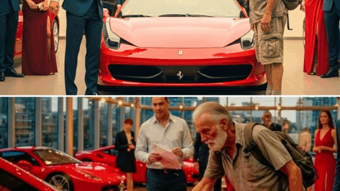 «Si puedes permitirte un Ferrari, te doy dos. Si puedes permitirte un Ferrari, te doy dos». El millonario se burló, su voz resonando en las paredes de cristal del concesionario. Siguió un coro de risas, como una orquesta de desprecio. De pie frente al reluciente coche rojo, un hombre mayor con sandalias y una mochila desgastada le sostuvo la mirada sin bajar la cabeza.
