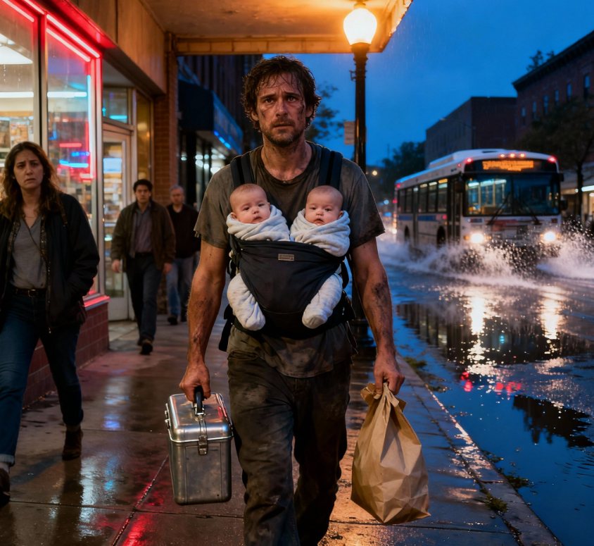 Las luces de la ciudad titilaban contra un cielo de noviembre descolorido mientras Daniel Brooks caminaba con dificultad por la acera agrietada, agarrando con una mano una caja de herramientas abollada y con la otra una fina bolsa de plástico del supermercado. Atados a su pecho estaban sus hijos gemelos, Matthew y Michael, de seis meses, suaves y dormidos, con sus cabecitas pegadas a su desteñida chaqueta de trabajo.