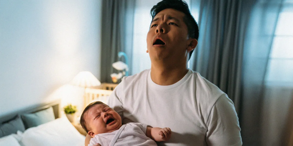 James luce cansado mientras sostiene a Lily | Fuente: Midjourney