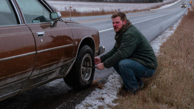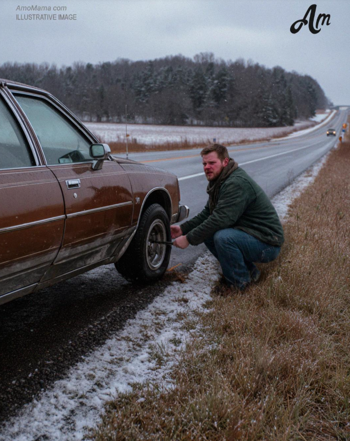 El hombre miraba con impotencia una llanta desinflada y completamente desinflada. La mujer se frotaba los brazos, temblando tanto que podía verla temblar desde la carretera.